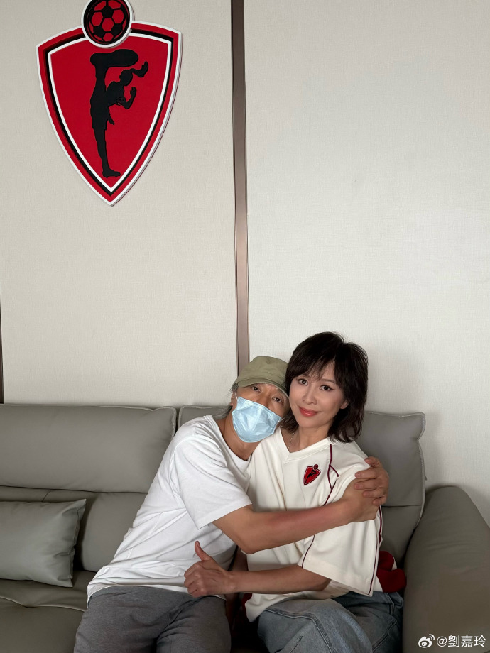 合照中,59岁的刘嘉玲穿着白色T恤,笑着竖起大拇指;62岁的周星驰戴着口罩和帽子,花白的头发十分显眼。